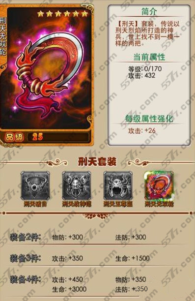 跟之前的劫炎相比,这个刑天的套装属性就给力的多了,组成这个套装的套件非别是:刑天破日、刑天战神铠、刑天五尊盔、刑天无双轮这四件,每件品级均为25,相当的高质呀。