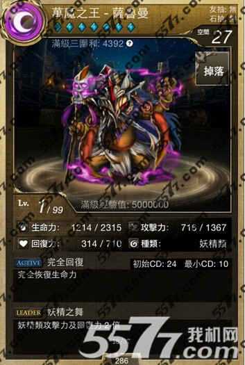 队长技 :妖精之舞,是其他妖精类攻击力和回复力的2倍,是现阶段回复值最高的卡牌。身为妖精强权队的唯一队长,可以通过吃光游满技15级。虽然目前出厂率不是很高,但是极具收藏价值。