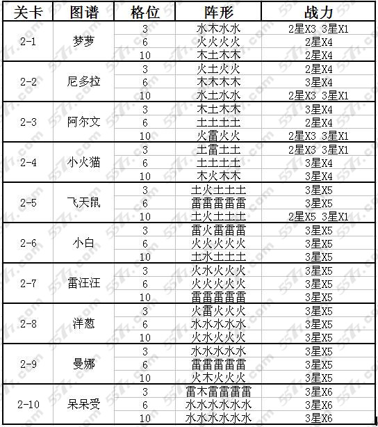 全民精灵第2图中,如果没有5个3星级的精灵,在2-1到2—10关卡中,是很难获得三星通关评价的,小编给大家整理出了全民精灵第2图中精灵的五行战力及阵型站位,希望能帮助到玩家顺利的通关第2图。