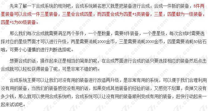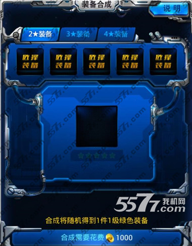 1、5件2星级的装备可以随机合成一件绿色装备,消耗1000金币。同理,5件三星的合成可以随机获得一件四星装备,三星合成消耗2000金币。