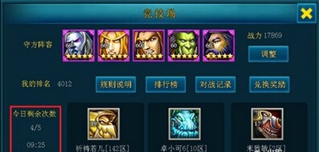 有了防御阵容就可以开始准备攻击其他玩家啦!画面中所显示的是你当前可攻击的玩家,在画面的下方有一个“战”按钮,只要点进去就会进入选择英雄进行战斗的画面。可攻击的玩家都是排名比你靠前的,不能攻击比自己名次低的玩家。