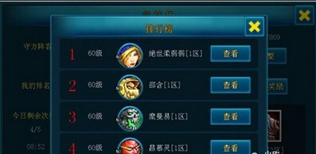 点击“排行榜”可以看到前50名的玩家信息,包括防御阵容和等级。