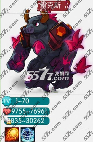 技能:雷克斯属性为火,所以他的技能肯定是与火有关,他可发出高熔量的火球,会对对方造成大面积烧灼伤害。雷克斯还有之中属性是针对自己队友的,当他受到攻击时可为全体队友带来中级攻击力,技能CD两回合。