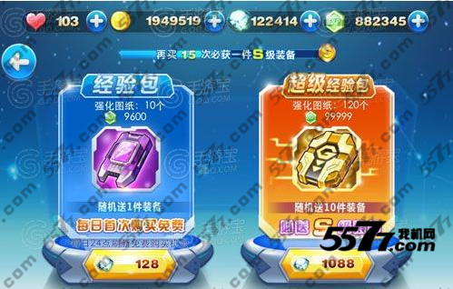 128钻石寻宝可以随机获得一件装备,每日首次购买免费,就是说玩家每天有一次免费抽奖的机会,购买128钻石经验包,可以获得强化图纸10张,玩家购买超级经验包,就可以获得120张强化图纸,每个可以增加99999经验,必定能获得S级装备。