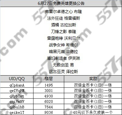 1:猜中每周免费英雄10个中的任意1个,送双倍金币卡(1日)一张,限量5张,随机抽取,送完即止