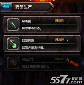 玩家在药品屋可以使用自身现有的材料生产不同效果的药品,从最基础的回复药剂到解除各种异常状态的药剂都有,但高级的药品需要跟随队伍等级的上涨才能够解锁,合成高级药品的素材也在高级的副本才有掉落。战斗中抓准使用药品的机会,往往可能扭转整个战局,而且在副本团灭的话,消耗的药品、体力都是可以返还的哦。