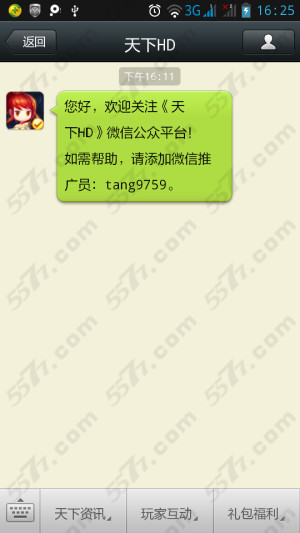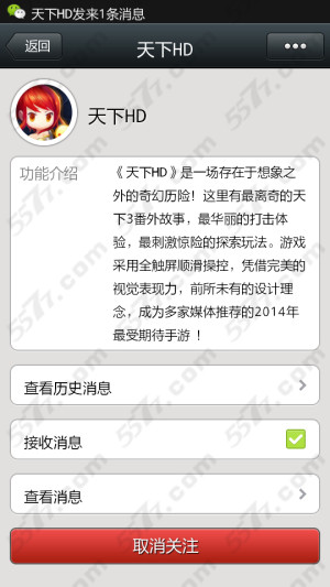 关注天下HD,你会发现有两个,第一个是九游的官方微信,而下面一个才是真正的官方微信!