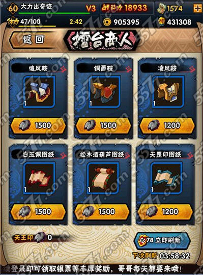 在我们夺宝之前必须要有马鞍,马鞍需要在拜龙头或者天王擂中收集天王印来兑换,同时我们还需要有宝物图纸,宝物图纸可以在天王擂台的擂台商人那里换取。在这里小编要提醒大家的是不要随便买图纸和马鞍,大家可以根据自己阵容里面的武将情缘,看看需要什么再买什么。