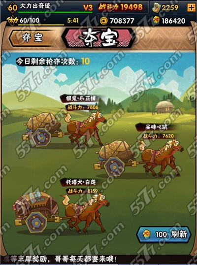 材料准备好之后我们进入夺宝模式,对于夺宝的难度问题玩家可以放心,因为系统匹配的都是一些战斗力比较低的玩家,如果你觉得匹配的玩家不合适,还可以点击刷新更换玩家。夺宝的次数限制是10次,但是每天的6点、12点、18点会对次数刷新,所以希望大家在刷新之前尽量打完。