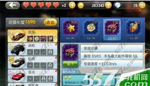 天天飞车配件系统里有一个叫变道引擎的配件很不错,稍微玩的久一些的玩家都知道天美经常在暗自改动车的属性,特别是隐藏属性。如变道速度。而现在出了这样一个配件,还想玩得好的玩家就只能砸钱去弄这个变道引擎了,下面,小编给大家介绍一下紫色变道引擎的满级属性。紫色变道引擎满级为65级,变道速度+13.03m/s。
