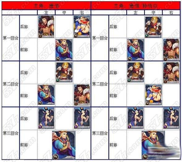 3号位推荐主T, 用来扛伤害,站住才能更好的输出。2号位是主T位,玩家可以把坦克能力最强的角色放在这里,因为这里常常要承受BOSS和后排的攻击。比较推荐放半肉半输出,能抗能打。或是使用肉盾治疗的角色,例如唐僧、王母这种有法抗的奶妈,同时因为3号位是战斗中第五位出手的,这个时候治疗的话就可以给1,2号位受到攻击的角色回血,以防回血断档太久被秒掉,如果放治疗的话一般推荐放唐僧这样的单体治疗。