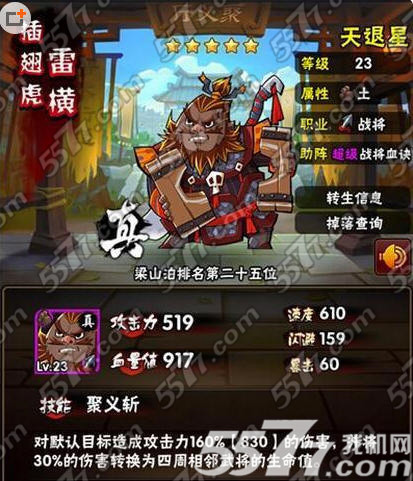 技能介绍:雷横的技能是聚义斩,可以在对对敌方单体造成160%攻击伤害的同时,将30%的伤害转化为周围武将的血量。