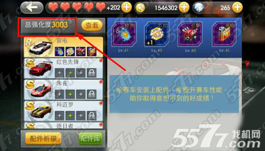 3、强化度只计算装备在车上的配件, 车库里好车越多越有优势,因为每辆车的配件栏只有1~4个(估计不会有几个人会把每辆车的油箱都开启吧?我只开了5辆车),于是,S车多的友友,就能比别人装备更多数量的配件, 一来可以提升总强化度,好处多多;二来利用赛车做背包,可以释放配件库空间。如果友友好车不多,请无视上面第2条提到的升级方式。