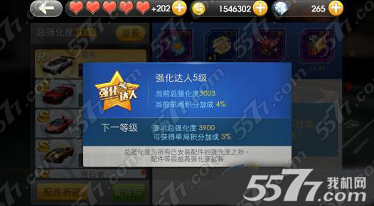 在天天飞车的配件系统里,右上角有一个叫总强化度的,点进去可以看到你的强化达人等级,这个强化达人等级越高,单局积分加成就越高。如下图强化达人5级,当前总强化度3003,当前单局积分加成4%。下一等级要求总强化度3900,可获得单局积分加成5%。