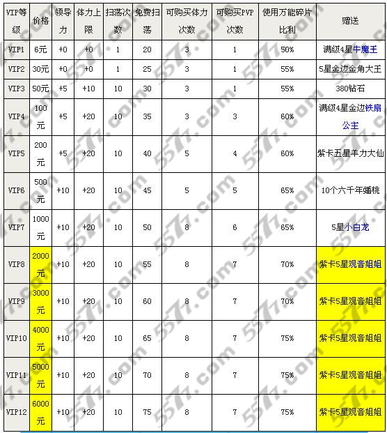 VIP5-VIP8:玩家不仅可以增加中量PVP次数、以及中量体力上限,在购买体力的次数上也有增加。这意味的玩家,可以使用更多的体力值去喔。并且还能获得更多的额外的特殊奖励(5星羊力大仙、10个六千年蟠桃、5星小白龙和5星特殊卡观音姐姐)