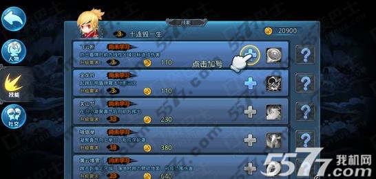 在技能界面,可以学习的技能会显示亮蓝色的“+”号,而不能学习的则显示灰色的“+”号,我们点击亮蓝色“+”号即可进行学习,学习技能要消耗一定的金币.