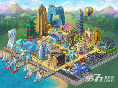 下面是一个摆放很合理,很理想的状态,看起来让人觉得很养眼,几幢大的建筑物,放眼望去就觉得很是气派,最左上角的建筑,弄得跟央视的大楼一样,还有金色的建筑是最高的,瞬间就觉得这是土豪聚集的地方,再看外围,车辆停放的非常的整齐,最左边停靠着帆船。大师级的手笔。