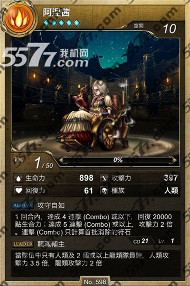 1级初始生命:898,攻击力为397,还有回复力则是61。这果然是等级还有星级上的差距啊有木有?下面再看看它的技能吧。看看大家对于这张卡牌是否满意呢?