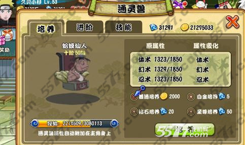 每一只通灵兽的原属性都包含体术、幻术、忍术。通过培养可以加强这些属性。通灵兽可以升级可以进阶,进阶之后的通灵兽原属性上限增加,比如一阶通灵兽原属性体术上限是150,二阶是250,十阶之后体术可以培养到1850。,
