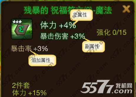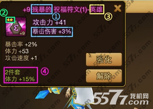 ①、表示符文的类别,是附加属性,如上图残暴的则对应下面的暴击伤害+3%,这个类别在强化过程中有可能会出现;