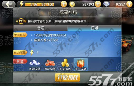 配件版本更新后,小编鸡冻的拿起手机,麻溜的更新了天天飞车,经过几天的体验,机智的小编终于在精英关卡中发现了“新大陆”。所有玩家都可以挑战祝福神庙,而且只有两次成功挑战的机会,难度分为普通和困难。困难关卡目标要求120秒内获得30W积分,碰撞次数小于5次,消耗体力7。