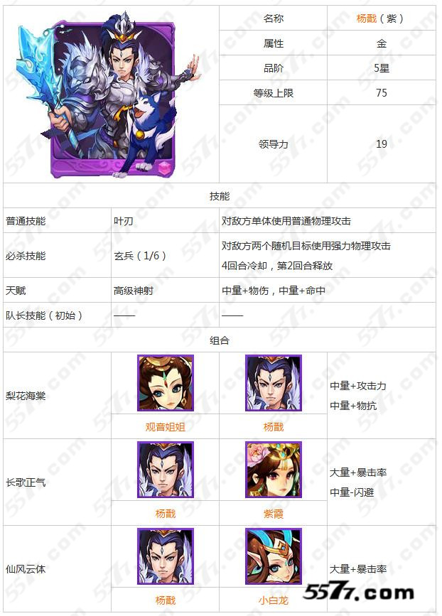 小编评价:杨戬是新手教程中必出的4星蓝卡,应该是玩家获得的第一张4星。物攻强大,技能随机攻击点赞,而且血厚,建议优先升级,前期绝对能顶再前排。