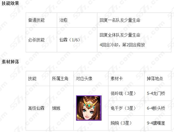 必杀技能:仙霖(1/6) 回复全体队友少量生命、4回合冷却,第2回合释放