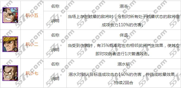 拜龙头的第50层守关的是阮氏三雄:阮小二、阮小七、阮小五。这三者的技能如下:
