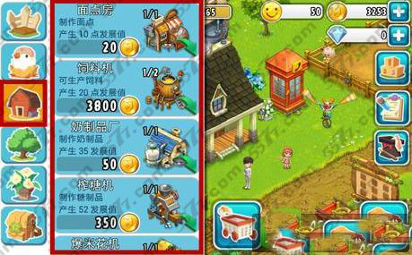作坊是用于生产必需品和赚钱的,这个需要3级以上才能购买。作坊非常有用,不仅能生产养殖家畜必须的饲料,还能生产面点、糖果等赚取金币。不同的作坊作用不一样,如“面点房”用于生产面点,而面点可以进行销售,满足订单(6级后开放),赚取的金币比纯种植物/养殖物收益高哦!又如“饲料机”,就是为家畜生产养殖所需饲料的,在《全民农场》中,饲料无法购买,只能通过“饲料机”生产,劳动才能致富哦!
