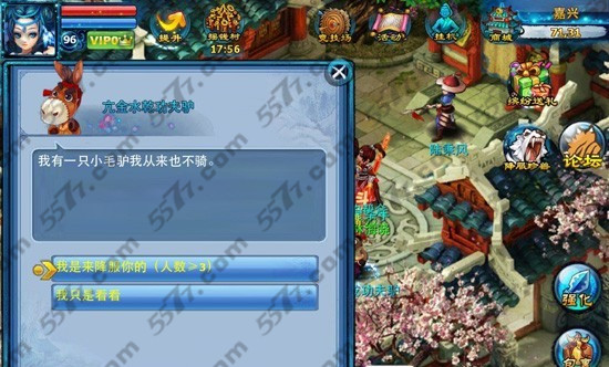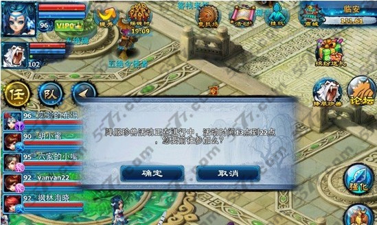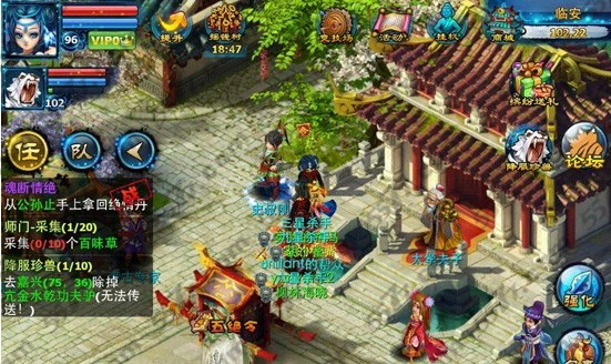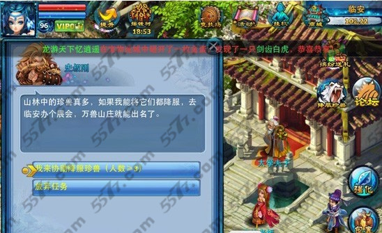 如果是新手玩家,点击屏幕右方白虎降服珍兽图标,传送至临安(99.27)史叔刚处,也可以自己走到史叔刚那里,三人以上组队领取任务,任务不能传送,需要自己硬着头皮找,如果方向感不好,还是把队长给别人吧。