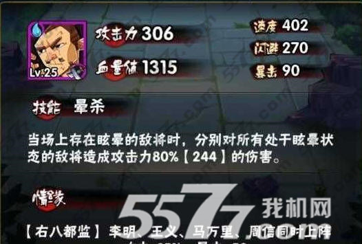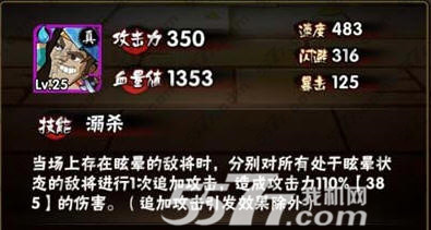 【晕杀】当场上存在眩晕的敌将时,分别对所有处于眩晕状态的敌将进行1次追加攻击,造成攻击力80%的伤害。