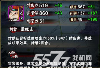 【佞宦弄权】对随机3名敌将造成相当于施法者攻击力50%的伤害,并有20%概率附加眩晕效果,持续2回合。