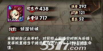 倾国倾城:当轮到自己出手时,对前排(前排空时则为后排)友将恢复相当于施法者攻击力90%的生命值。