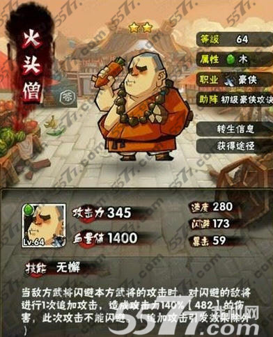大抵配置如上所示,可以是四个或者五个火头僧搭配鲁智深即可,将火头僧升级到30级,保证轻松过关!有点玩家可能会说,同一个武将不是只能上阵一个吗?对于蓝卡和紫卡来说是这样的,每张卡只有一个五行,同一五行只能上阵一个。对于白卡来说也是如此,但是白卡火头僧有不同的五行属性,只要属性不同即可上阵,这样的话,火头僧就能上阵5个。五个火头僧,能确保140关顺利通过,大家是不是看着觉得很滑稽,但是这套阵容的效果确是实实在在实用,没有通过拜龙头140关的小伙伴可以试一下。接下来给大家看一下火头僧的人物属性技能。