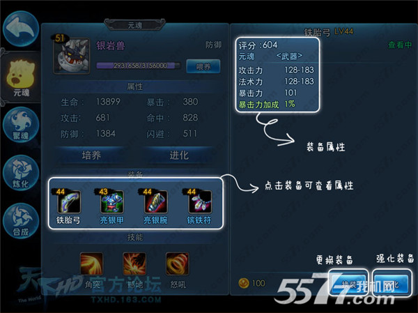 首先是元魂主界面,在这里我们可以查看元魂属性,潜能培养,喂养经验丹,进化,装备操作,更换上阵元魂等;