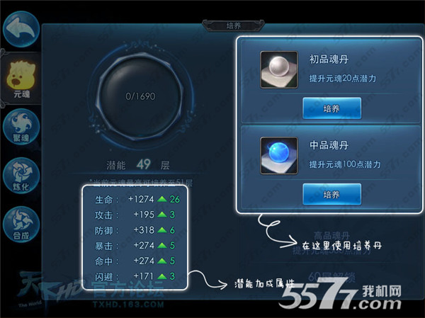 ④培养:在这里可以使用魂丹培养元魂的潜能哦,从而增加元魂的各方面属性;