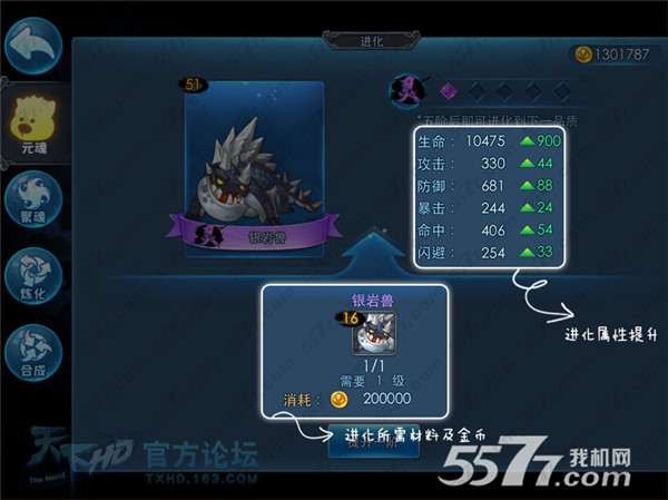 ⑤进化:在这里可以使用同种元魂作为材料进化元魂,使元魂的品质上升;