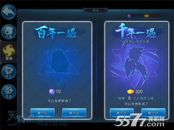 聚魂:通过凝聚元魂我们就可以随机获得一个元魂了,可使用魂晶聚魂,也可使用元宝聚魂,每隔一段时间还可免费聚魂一次。