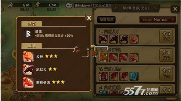 风属性的BOSS , 火地狱犬又派上用场啦 , 这关直接火地狱犬加好的火基友直接送BOSS回村就好 , 此时你因为第四关的洗礼想必符文都会乖乖的升级 , 这关会掉2星火熊 , 还满容易掉的可以打些来练风水熊的技能(风水世家?)