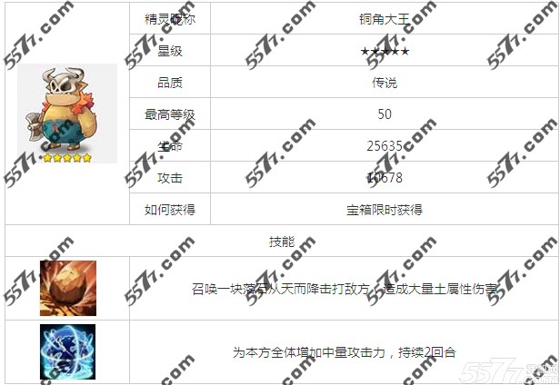 铜角大王属于5星精灵,拥有25635的满级生命值和10678的满级攻击力,总的来说,属性还是很不错的!该精灵技能为单攻和全体攻击力增益,技能方面也是非常出色的!