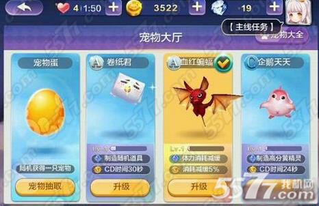 首先,点击大厅中的“宠物“按钮,进入宠物界面:点击左边的抽蛋可以获得新的宠物,抽到已有宠物会让已有宠物升级而不是浪费钱,赞一个!四种抽取方式:C~B级,B~A级,A~S级,关卡掉落的碎片抽取,土豪与屌丝共享宠物乐趣,啧啧