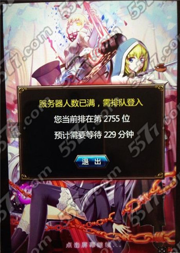 小编早上登游戏的时候,还能在游戏中愉快的玩耍看漫画剧情,刷副本,但是到了晚上就出现了上图所示的情况,该死的服务器爆满,把我及许多的玩家都挡在外面,游戏一直在排队中,且排队的速度比较的慢,就如同早高峰路上堵车,开车到公司需要的时间太久,简直无法吐槽。游戏排队也是如此,不过这也反映出了一款游戏的火爆程度,证明游戏好玩,才会有这么多的人连接服务器,造成服务器爆满排队的情况。2755人排队,它却说需要229分钟,小编简直是无法吐槽。