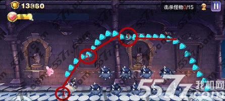 另外,除了跳跃和二段跳之外,天天风之旅中的人物在奔跑中还能滑行。因为有的路段比较宽,只靠二段跳是跳不过去的,所以我们需要用到滑行技巧。 先在“1”处起跳,在“2”处使用二段跳,重点来了,先让角色向下降一些,不然距离不够,然后在“3”处按一下攻击键,你会发现角色在空中滞留时间明显增加。 于是,我们就轻轻松松地滑过来了。 但是注意不要漂过了,飘过了没准这个坑没掉反而掉到下一个坑里或者和小怪装个满怀那就白漂了,我个人感觉基本上按一下就够了,再远点的按两下,按三下的时候很少,具体自己试试感受一下就知道了在经典模式中也有许多这样的关卡,大家要记住诀窍:在空中按一下攻击键。