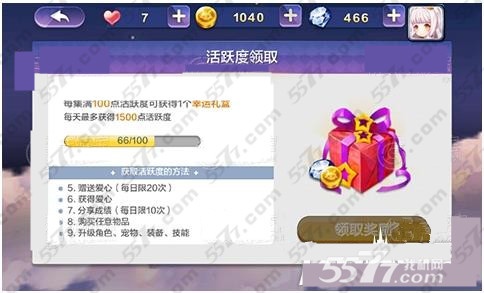 作用:在天天风之旅游戏中,活跃度最大的作用是可以获得一个幸运礼盒。玩家在游戏中,每天收集齐100点活跃度就可以获得一个幸运礼盒。在幸运礼盒,如果玩家的运气不错的话,那么开出的东西还是非常不错的。