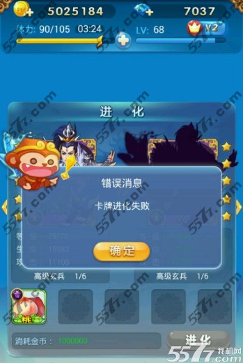 真实要死了,今天一大早进行了卡牌进化,点击卡牌进化页面,开始没主要,后来才发现下面的进化材料显示为蟠桃卡牌!消耗了100万金币进化了,但是游戏缺提示我进化卡牌失败!这是BUG吗?具体如下图: