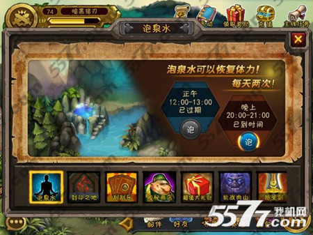 剑圣传奇泡泉水系统是从游戏桌面上直接进去的,有规定一定的时间才能泡,泡泉水可以恢复体力。