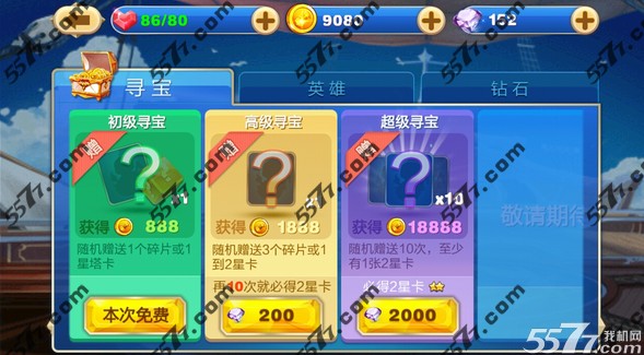 说明的是,通过初级和高级寻宝获得的一般为英雄碎片,或者小几率的得到2星英雄卡。而超级寻宝至少能够得到1张2星卡英雄哦!