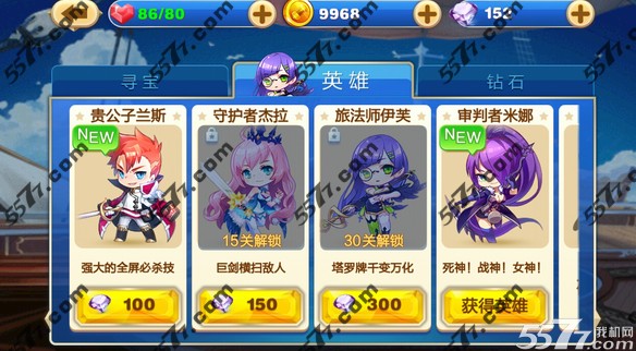 说明是,玩家你每天有一次免费的机会,其他时候嘛,呵呵,你懂的。也可以在这个界面购买英雄或者钻石。当然,稀有英雄“审判者米娜”只能能通过寻宝得到噢!