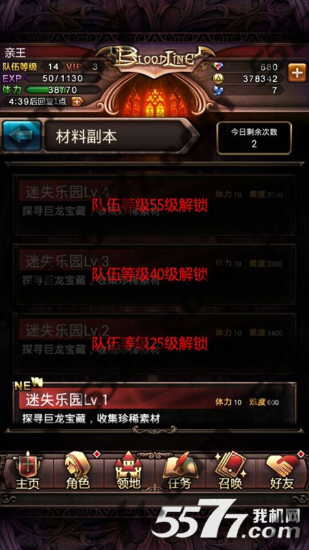地底传说每天可闯2次,每次消耗10点体力,难度被系统定位600,每天迷失乐园最后Boss不是固定不变的,完成可以得到大量的材料,是玩家必备副本。