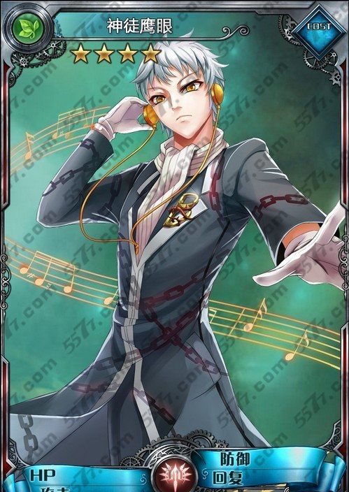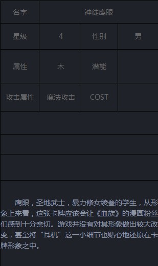 鹰眼,圣地武士,暴力修女绫叁的学生,从形象上来看,这张卡牌应该会让《血族》的漫画粉丝们感到十分亲切。游戏并没有对其形象做出较大改变,甚至将“耳机”这一小细节也贴心地还原在卡牌形象之中。